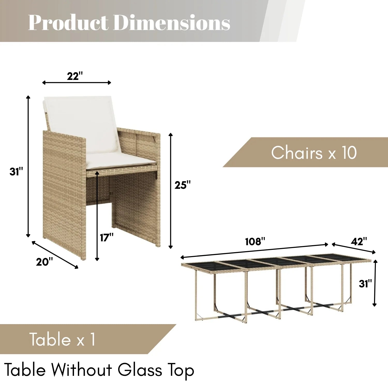 - 10 Chair Dimension: 22″Lx20″Wx31″H